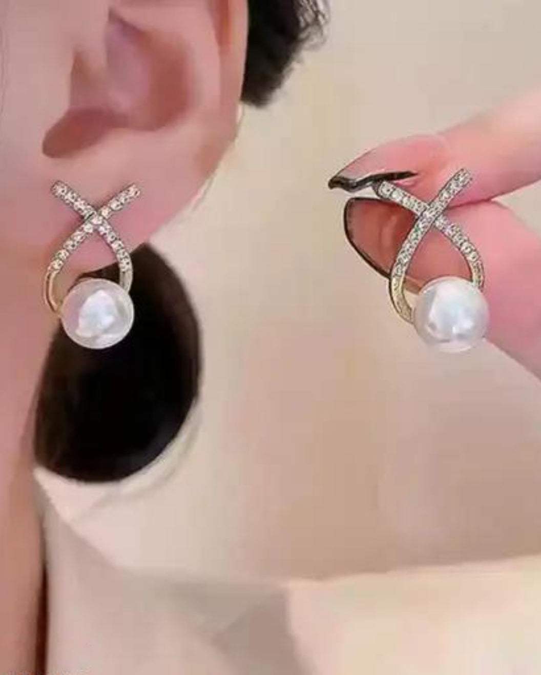 Indulge in the timeless beauty of pearls fused with a sparkling contemporary twist. These exquisite earrings feature a graceful "X" design encrusted with shimmering crystals, cradling a luminous faux pearl that adds a sophisticated finish.