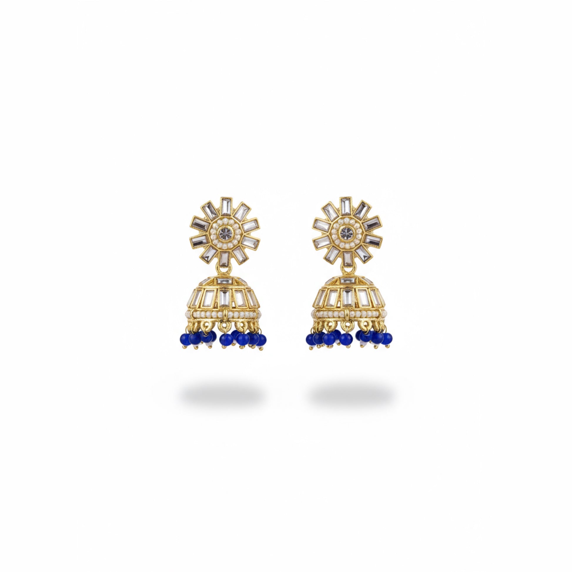 Geometric Kundan Jhumka Earrings with Blue Beads | Elegant Gold-Plated Ethnic Jewelry by Mera Jhumka