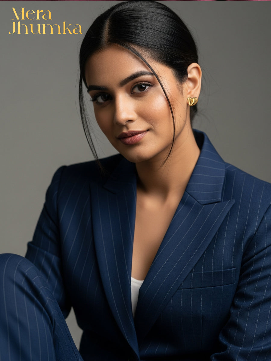 Celebrate elegance with a touch of romance through Mera Jhumka’s Anti Tarnish Golden Bloom Heart Studs. Crafted in a sculpted, three-petal heart design, these earrings are a unique twist on the classic symbol of love. The rich gold-tone finish paired with the fluid, petal-like form brings depth, shine, and artistic charm to your everyday look.