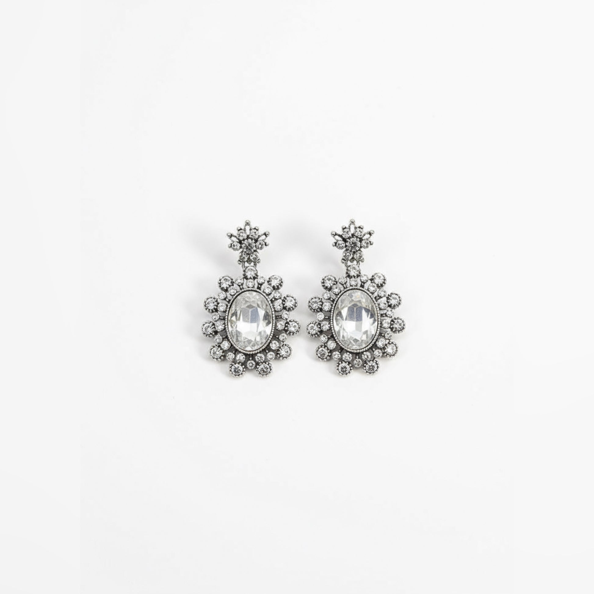 Capture the spotlight with these silver crystal statement earrings from Mera Jhumka, expertly crafted for women who love classic glamour and dazzling elegance. Featuring a bold oval center stone surrounded by sparkling crystals in an intricate, vintage-inspired floral setting, these earrings bring regal charm to bridal, party, and evening outfits. The high-shine, silver-tone finish ensures brilliance from every angle, while the lightweight design and secure push-back closure guarantee comfortable, all-day wear for special occasions or festive events.